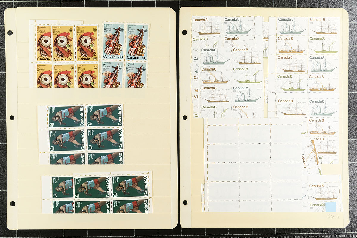 Volume 7 - Mint Canada wholesale stock (#586/694). This volume is from the QEII Caricature to the 20c "Archer". Generally, one issue per stockpage. Anywhere from 10 to a couple hundred stamps per page. Lots of multiples with relatively few plate blocks. A quick check indicates that most, if not all, are never hinged. From the mid-1970s, with over 100 of the $1 Vancouver (#600), and quantities of the Montreal Olympics $1 and $2 Sculptors and Buildings. A late bonus is 8 plate blocks of the 1982 $2 Commonwealth Day. Enormous catalogue value here. Conservative face value =