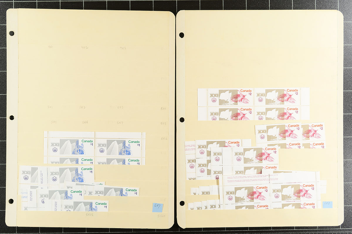 Volume 7 - Mint Canada wholesale stock (#586/694). This volume is from the QEII Caricature to the 20c "Archer". Generally, one issue per stockpage. Anywhere from 10 to a couple hundred stamps per page. Lots of multiples with relatively few plate blocks. A quick check indicates that most, if not all, are never hinged. From the mid-1970s, with over 100 of the $1 Vancouver (#600), and quantities of the Montreal Olympics $1 and $2 Sculptors and Buildings. A late bonus is 8 plate blocks of the 1982 $2 Commonwealth Day. Enormous catalogue value here. Conservative face value =