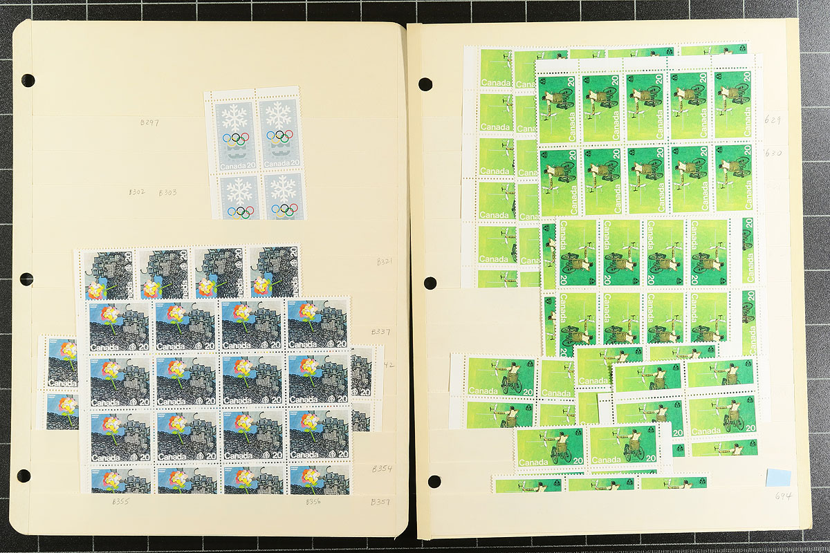 Volume 7 - Mint Canada wholesale stock (#586/694). This volume is from the QEII Caricature to the 20c "Archer". Generally, one issue per stockpage. Anywhere from 10 to a couple hundred stamps per page. Lots of multiples with relatively few plate blocks. A quick check indicates that most, if not all, are never hinged. From the mid-1970s, with over 100 of the $1 Vancouver (#600), and quantities of the Montreal Olympics $1 and $2 Sculptors and Buildings. A late bonus is 8 plate blocks of the 1982 $2 Commonwealth Day. Enormous catalogue value here. Conservative face value =