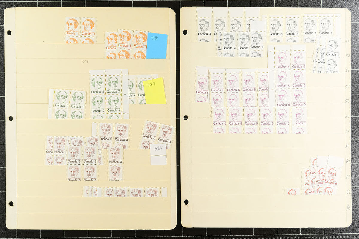Volume 7 - Mint Canada wholesale stock (#586/694). This volume is from the QEII Caricature to the 20c "Archer". Generally, one issue per stockpage. Anywhere from 10 to a couple hundred stamps per page. Lots of multiples with relatively few plate blocks. A quick check indicates that most, if not all, are never hinged. From the mid-1970s, with over 100 of the $1 Vancouver (#600), and quantities of the Montreal Olympics $1 and $2 Sculptors and Buildings. A late bonus is 8 plate blocks of the 1982 $2 Commonwealth Day. Enormous catalogue value here. Conservative face value =