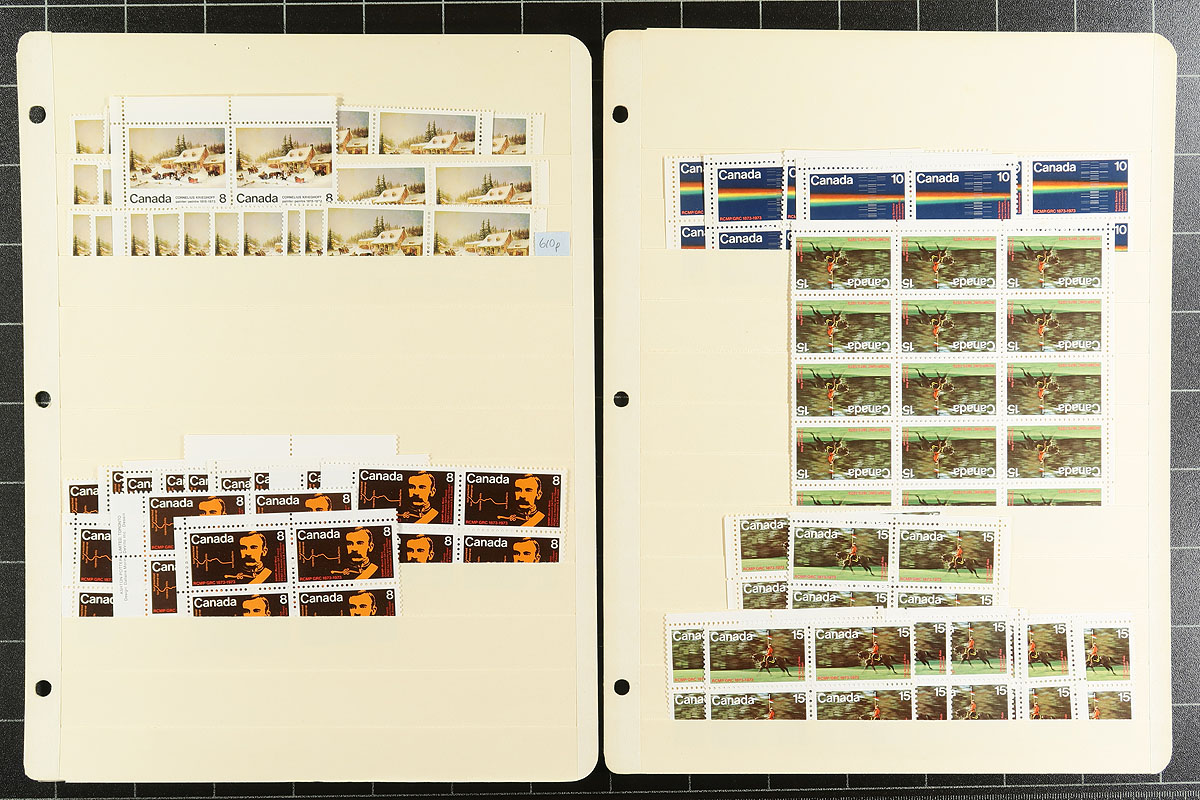 Volume 7 - Mint Canada wholesale stock (#586/694). This volume is from the QEII Caricature to the 20c "Archer". Generally, one issue per stockpage. Anywhere from 10 to a couple hundred stamps per page. Lots of multiples with relatively few plate blocks. A quick check indicates that most, if not all, are never hinged. From the mid-1970s, with over 100 of the $1 Vancouver (#600), and quantities of the Montreal Olympics $1 and $2 Sculptors and Buildings. A late bonus is 8 plate blocks of the 1982 $2 Commonwealth Day. Enormous catalogue value here. Conservative face value =