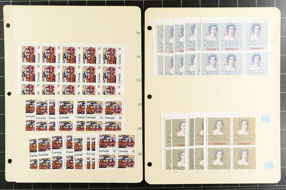 Volume 7 - Mint Canada wholesale stock (#586/694). This volume is from the QEII Caricature to the 20c "Archer". Generally, one issue per stockpage. Anywhere from 10 to a couple hundred stamps per page. Lots of multiples with relatively few plate blocks. A quick check indicates that most, if not all, are never hinged. From the mid-1970s, with over 100 of the $1 Vancouver (#600), and quantities of the Montreal Olympics $1 and $2 Sculptors and Buildings. A late bonus is 8 plate blocks of the 1982 $2 Commonwealth Day. Enormous catalogue value here. Conservative face value =