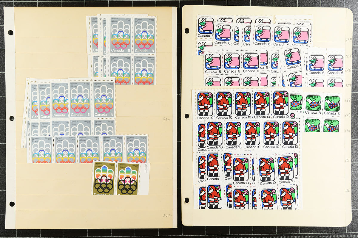 Volume 7 - Mint Canada wholesale stock (#586/694). This volume is from the QEII Caricature to the 20c "Archer". Generally, one issue per stockpage. Anywhere from 10 to a couple hundred stamps per page. Lots of multiples with relatively few plate blocks. A quick check indicates that most, if not all, are never hinged. From the mid-1970s, with over 100 of the $1 Vancouver (#600), and quantities of the Montreal Olympics $1 and $2 Sculptors and Buildings. A late bonus is 8 plate blocks of the 1982 $2 Commonwealth Day. Enormous catalogue value here. Conservative face value =