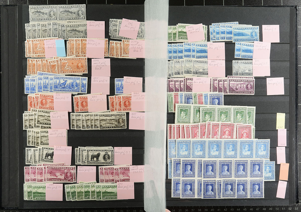A "Half-Century" accumulation of mint Newfoundland issues in wholesale quantities, with better singles, Scott or Unitrade listed variants (such as different perforations), multiples and a worthwhile section of airmail and postage due issues. Great condition, lots of lightly or never hinged material and few visible faults. From 1 to 150 of a type. The catalogue value of this lot quickly rockets past US$1000.00, and it all comes in a nice 32-page Alligator acetate strip stockbook. Estimate =