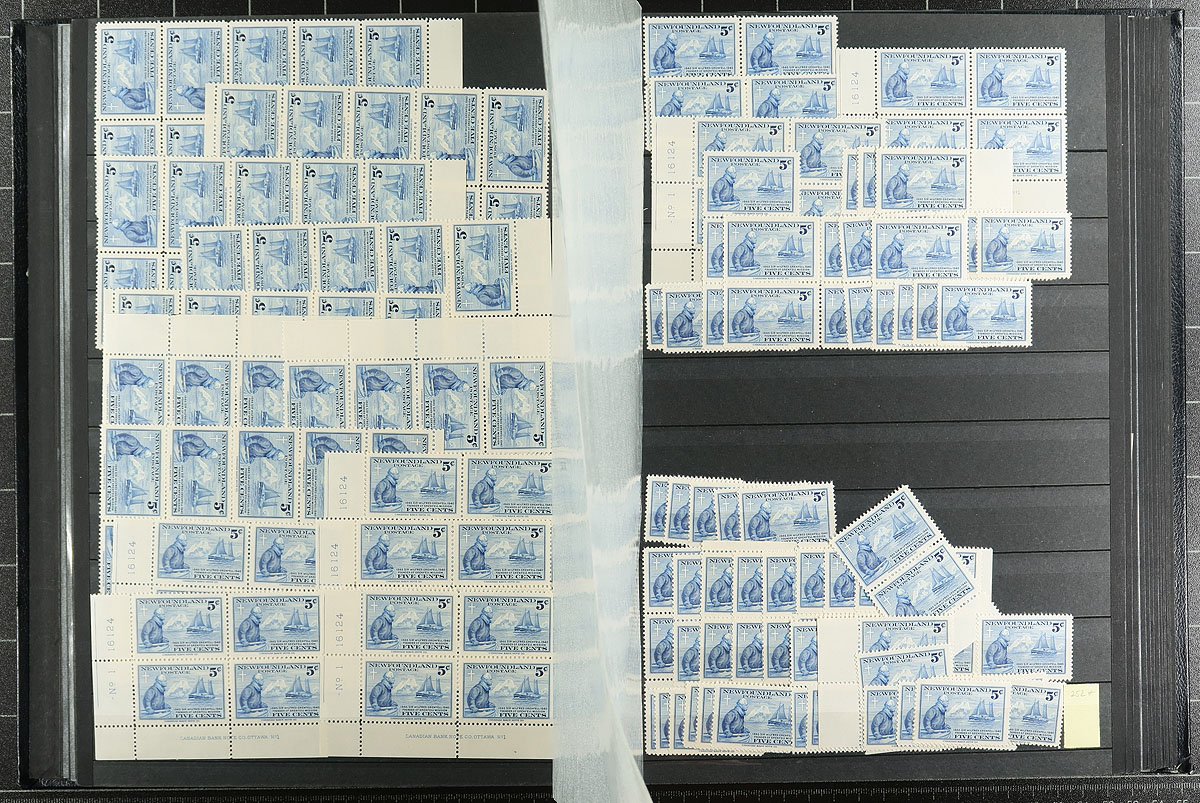 A "Half-Century" accumulation of mint Newfoundland issues in wholesale quantities, with better singles, Scott or Unitrade listed variants (such as different perforations), multiples and a worthwhile section of airmail and postage due issues. Great condition, lots of lightly or never hinged material and few visible faults. From 1 to 150 of a type. The catalogue value of this lot quickly rockets past US$1000.00, and it all comes in a nice 32-page Alligator acetate strip stockbook. Estimate =