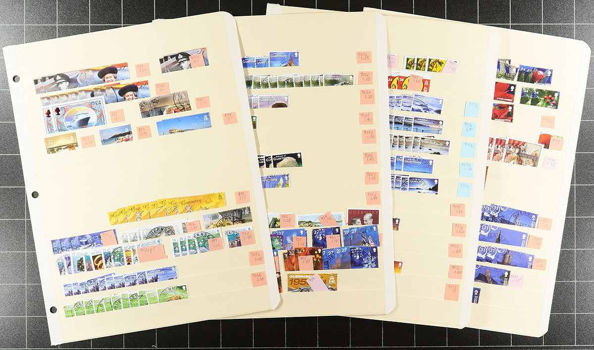 Two binders, one large, one narrow with an extensive accumulation of postally used Guernsey (and some Alderney) to about 2010, plus some WWII German occupation issues. Comprehensive, extensive and in decent condition. Many complete sets, with topical appeal, and individual denominations to £5. Noted #640-643 with four extra copies of #643. Includes more recent "post-paid" rates, including Europe and Overseas. Just missing the souvenir sheets. Often up to 20 of a type, making this perfect for a dealer, or a collector wanting to put in some "sweat equity" by covering their costs by selling the duplicates. A remarkable lot from a local collector, never seen by the collecting community before. Estimate =