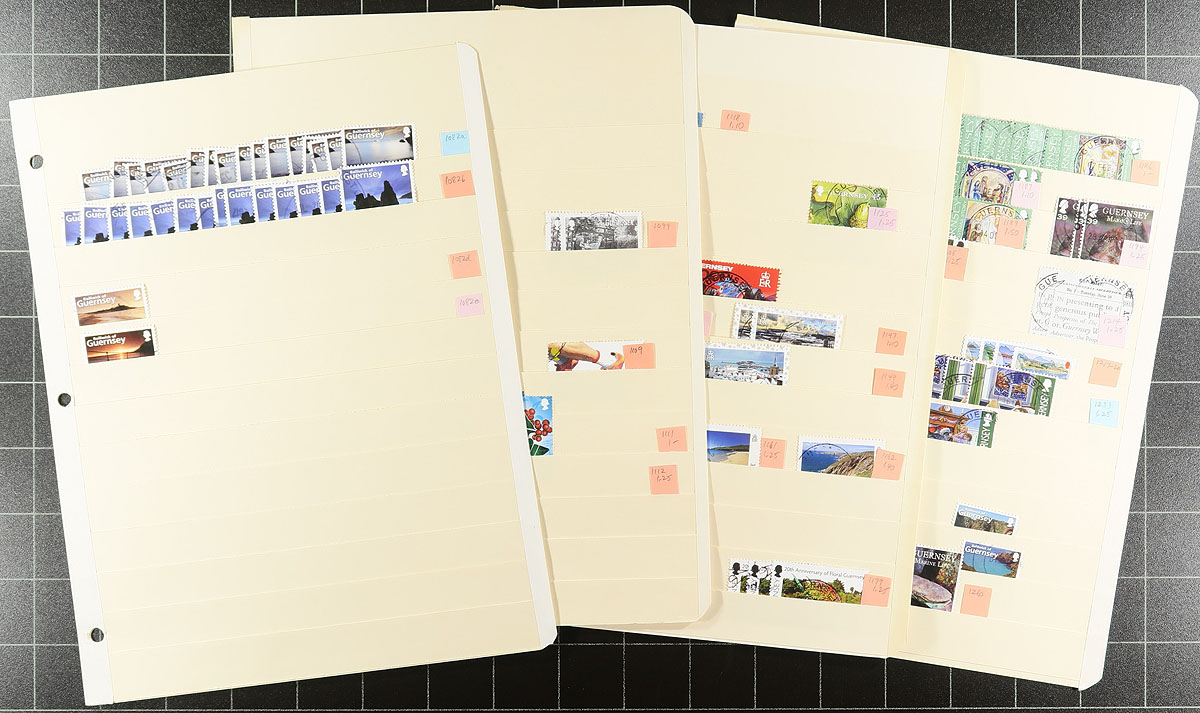 Two binders, one large, one narrow with an extensive accumulation of postally used Guernsey (and some Alderney) to about 2010, plus some WWII German occupation issues. Comprehensive, extensive and in decent condition. Many complete sets, with topical appeal, and individual denominations to £5. Noted #640-643 with four extra copies of #643. Includes more recent "post-paid" rates, including Europe and Overseas. Just missing the souvenir sheets. Often up to 20 of a type, making this perfect for a dealer, or a collector wanting to put in some "sweat equity" by covering their costs by selling the duplicates. A remarkable lot from a local collector, never seen by the collecting community before. Estimate =