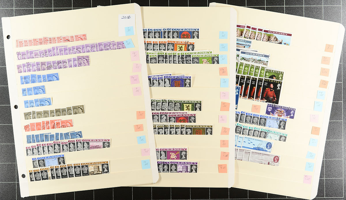 Two binders, one large, one narrow with an extensive accumulation of postally used Guernsey (and some Alderney) to about 2010, plus some WWII German occupation issues. Comprehensive, extensive and in decent condition. Many complete sets, with topical appeal, and individual denominations to £5. Noted #640-643 with four extra copies of #643. Includes more recent "post-paid" rates, including Europe and Overseas. Just missing the souvenir sheets. Often up to 20 of a type, making this perfect for a dealer, or a collector wanting to put in some "sweat equity" by covering their costs by selling the duplicates. A remarkable lot from a local collector, never seen by the collecting community before. Estimate =