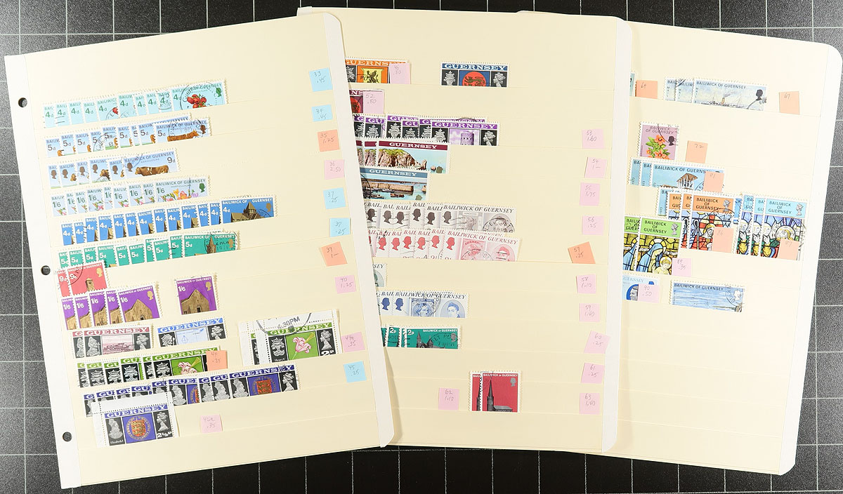 Two binders, one large, one narrow with an extensive accumulation of postally used Guernsey (and some Alderney) to about 2010, plus some WWII German occupation issues. Comprehensive, extensive and in decent condition. Many complete sets, with topical appeal, and individual denominations to £5. Noted #640-643 with four extra copies of #643. Includes more recent "post-paid" rates, including Europe and Overseas. Just missing the souvenir sheets. Often up to 20 of a type, making this perfect for a dealer, or a collector wanting to put in some "sweat equity" by covering their costs by selling the duplicates. A remarkable lot from a local collector, never seen by the collecting community before. Estimate =