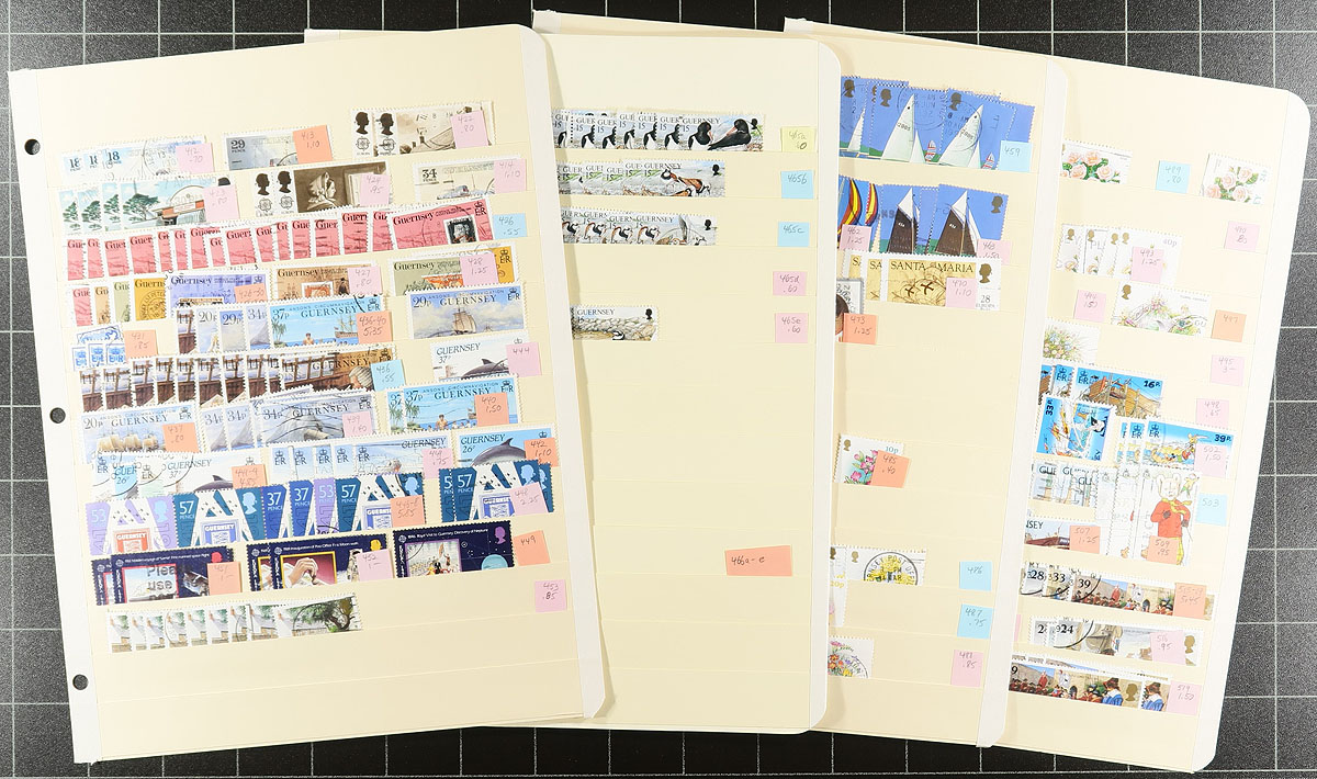 Two binders, one large, one narrow with an extensive accumulation of postally used Guernsey (and some Alderney) to about 2010, plus some WWII German occupation issues. Comprehensive, extensive and in decent condition. Many complete sets, with topical appeal, and individual denominations to £5. Noted #640-643 with four extra copies of #643. Includes more recent "post-paid" rates, including Europe and Overseas. Just missing the souvenir sheets. Often up to 20 of a type, making this perfect for a dealer, or a collector wanting to put in some "sweat equity" by covering their costs by selling the duplicates. A remarkable lot from a local collector, never seen by the collecting community before. Estimate =