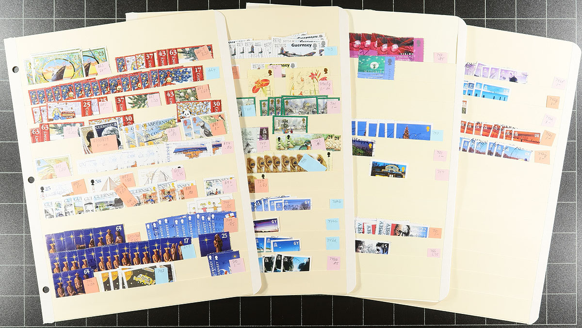 Two binders, one large, one narrow with an extensive accumulation of postally used Guernsey (and some Alderney) to about 2010, plus some WWII German occupation issues. Comprehensive, extensive and in decent condition. Many complete sets, with topical appeal, and individual denominations to £5. Noted #640-643 with four extra copies of #643. Includes more recent "post-paid" rates, including Europe and Overseas. Just missing the souvenir sheets. Often up to 20 of a type, making this perfect for a dealer, or a collector wanting to put in some "sweat equity" by covering their costs by selling the duplicates. A remarkable lot from a local collector, never seen by the collecting community before. Estimate =