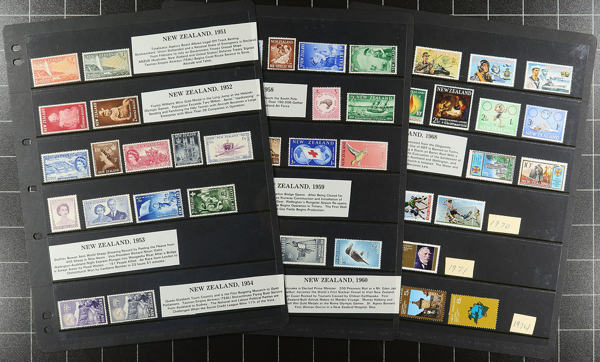 Anguilla to New Zealand on black stockpages (most Vario, some Hagner). Mostly mint, King George VI to about 2002. Mostly a page or two per country, strong in Australia and New Zealand, but we saw Antigua, Bahamas, Bermuda, British Honduras, Cayman Is, Christmas Is, Cocos (Keeling), Cook Is, Dominica, Gambia, Gilbert Is, Grenada, Jamaica, Malta, Mauritius, Montserrat and more! Singles, sets, short sets. Great topical appeal, and better values scattered throughout. All in great condition, including the pages! Estimate =