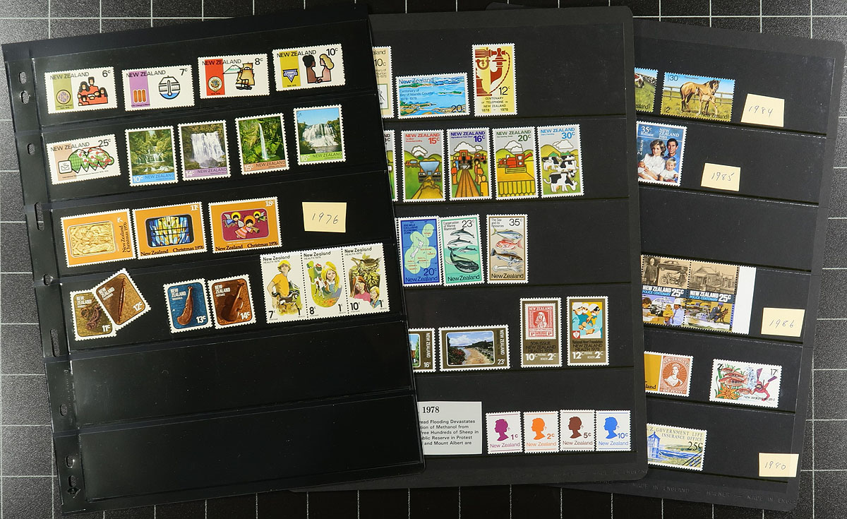 Anguilla to New Zealand on black stockpages (most Vario, some Hagner). Mostly mint, King George VI to about 2002. Mostly a page or two per country, strong in Australia and New Zealand, but we saw Antigua, Bahamas, Bermuda, British Honduras, Cayman Is, Christmas Is, Cocos (Keeling), Cook Is, Dominica, Gambia, Gilbert Is, Grenada, Jamaica, Malta, Mauritius, Montserrat and more! Singles, sets, short sets. Great topical appeal, and better values scattered throughout. All in great condition, including the pages! Estimate =