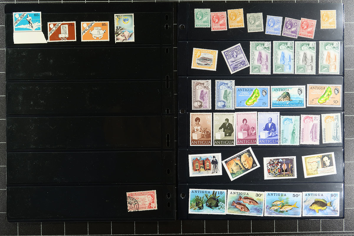Anguilla to New Zealand on black stockpages (most Vario, some Hagner). Mostly mint, King George VI to about 2002. Mostly a page or two per country, strong in Australia and New Zealand, but we saw Antigua, Bahamas, Bermuda, British Honduras, Cayman Is, Christmas Is, Cocos (Keeling), Cook Is, Dominica, Gambia, Gilbert Is, Grenada, Jamaica, Malta, Mauritius, Montserrat and more! Singles, sets, short sets. Great topical appeal, and better values scattered throughout. All in great condition, including the pages! Estimate =