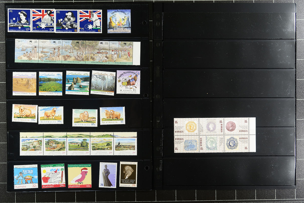 Anguilla to New Zealand on black stockpages (most Vario, some Hagner). Mostly mint, King George VI to about 2002. Mostly a page or two per country, strong in Australia and New Zealand, but we saw Antigua, Bahamas, Bermuda, British Honduras, Cayman Is, Christmas Is, Cocos (Keeling), Cook Is, Dominica, Gambia, Gilbert Is, Grenada, Jamaica, Malta, Mauritius, Montserrat and more! Singles, sets, short sets. Great topical appeal, and better values scattered throughout. All in great condition, including the pages! Estimate =