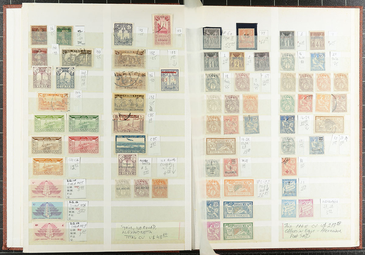 Africa and Middle East in an older 16-page Alligator divided page stockbook. Lebanon, Syria, Rouad, Alexandretta, Egypt (Alexandria, Port Said), Cilicia, Turkish Empire, Afars & Isis, Somalia. Mint, used, mostly pre-1950, with light to moderate duplication and some unusual material. Most identified and priced by 2019 Scott. Owner’s older 2019 Scott US$1328.95 =