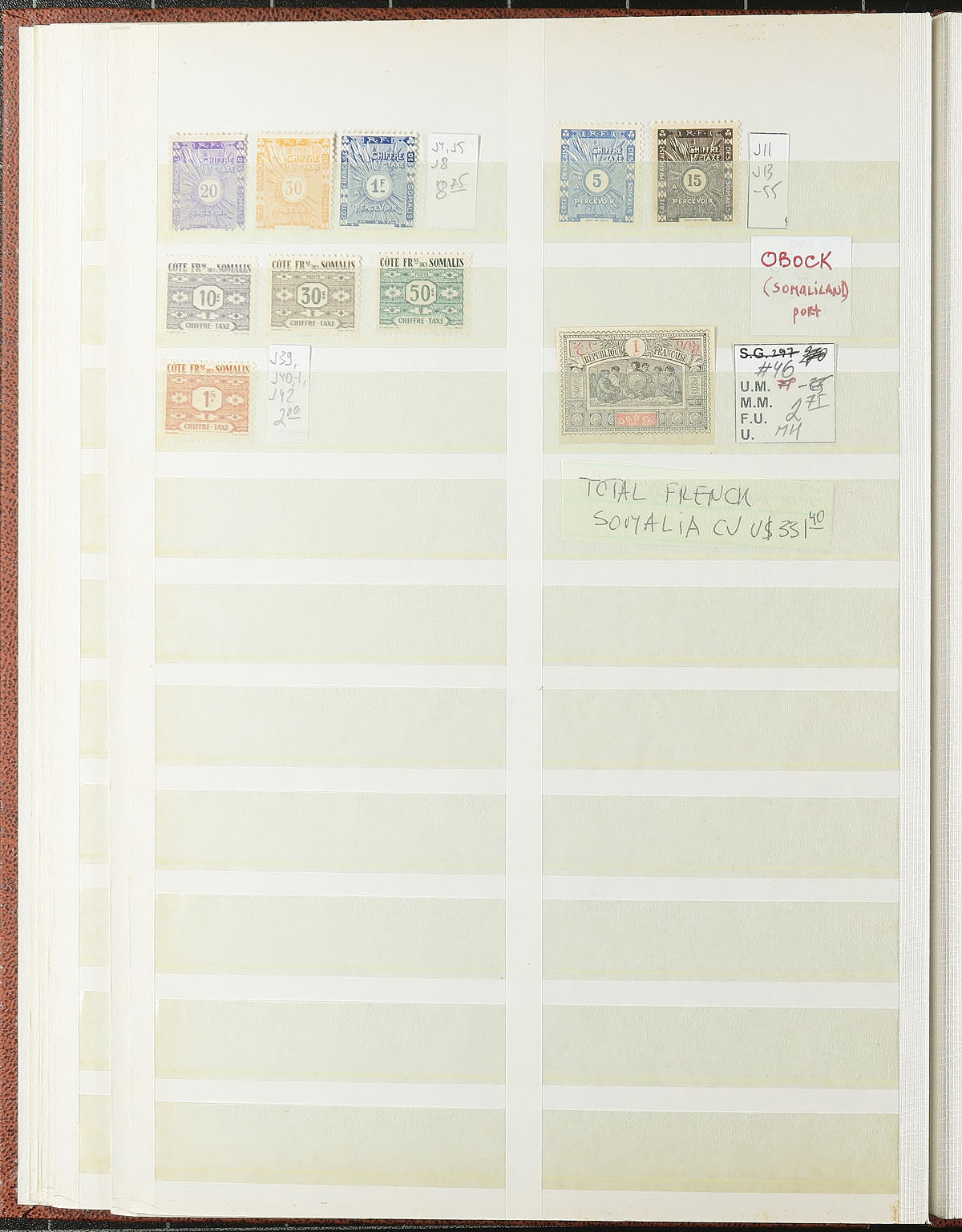 Africa and Middle East in an older 16-page Alligator divided page stockbook. Lebanon, Syria, Rouad, Alexandretta, Egypt (Alexandria, Port Said), Cilicia, Turkish Empire, Afars & Isis, Somalia. Mint, used, mostly pre-1950, with light to moderate duplication and some unusual material. Most identified and priced by 2019 Scott. Owner’s older 2019 Scott US$1328.95 =