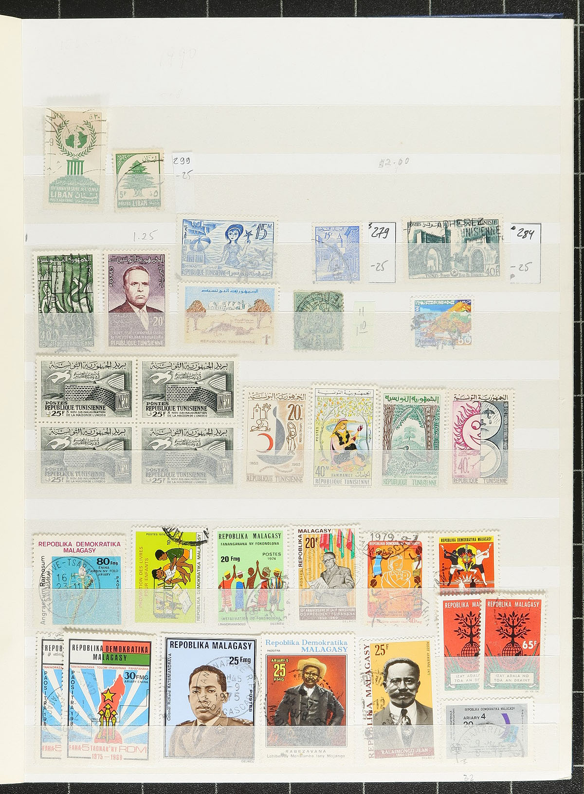 A wide-ranging group of French colonies and territories filling a 32-page Uni-Safe stockbook. Countries represented include Malagasy Madagascar, Djibouti, Algeria, Libya, Morocco, Laos, Cambodia, Levant, Guadeloupe, Guiana, FSAT, Wallis and Futuna, St. Pierre and Miquelon (lots of postage dues), and more! Owner counts 2,510 stamps, with moderate to heavy duplication. Mint, used, mostly more common items, but with individual items to $10.00 catalogue value. Great exploration lot here! Estimate =