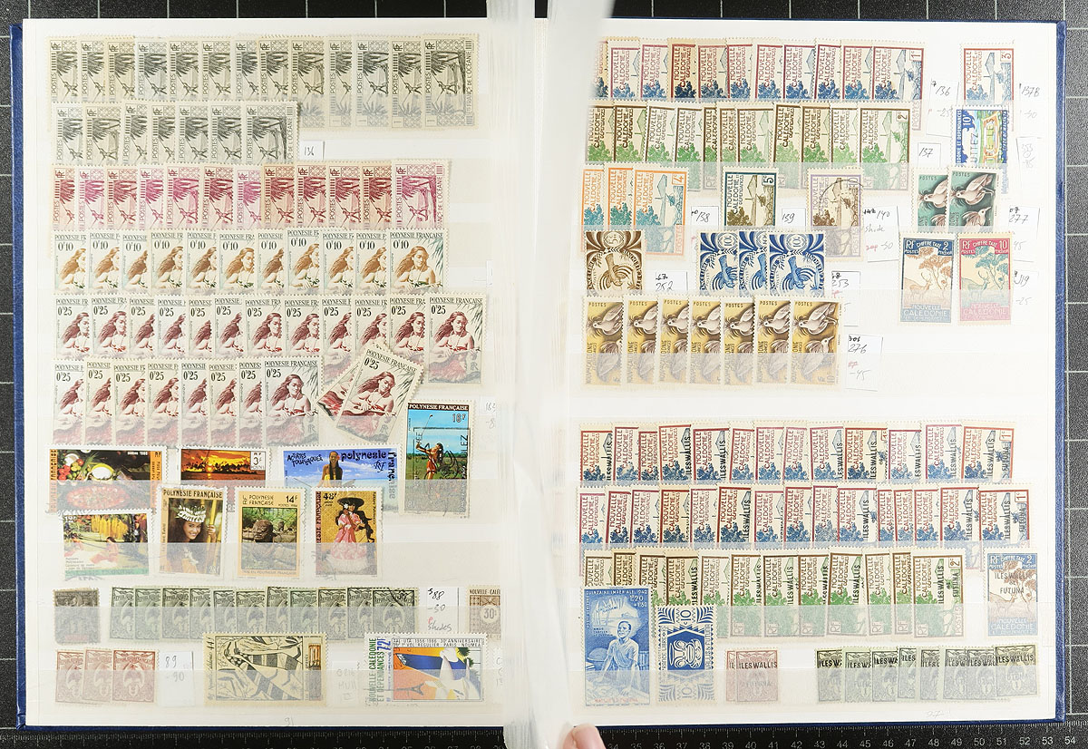 A wide-ranging group of French colonies and territories filling a 32-page Uni-Safe stockbook. Countries represented include Malagasy Madagascar, Djibouti, Algeria, Libya, Morocco, Laos, Cambodia, Levant, Guadeloupe, Guiana, FSAT, Wallis and Futuna, St. Pierre and Miquelon (lots of postage dues), and more! Owner counts 2,510 stamps, with moderate to heavy duplication. Mint, used, mostly more common items, but with individual items to $10.00 catalogue value. Great exploration lot here! Estimate =