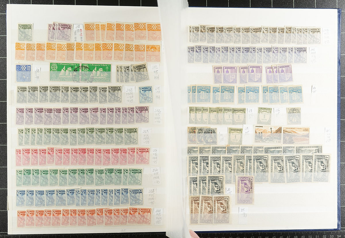 A wide-ranging group of French colonies and territories filling a 32-page Uni-Safe stockbook. Countries represented include Malagasy Madagascar, Djibouti, Algeria, Libya, Morocco, Laos, Cambodia, Levant, Guadeloupe, Guiana, FSAT, Wallis and Futuna, St. Pierre and Miquelon (lots of postage dues), and more! Owner counts 2,510 stamps, with moderate to heavy duplication. Mint, used, mostly more common items, but with individual items to $10.00 catalogue value. Great exploration lot here! Estimate =