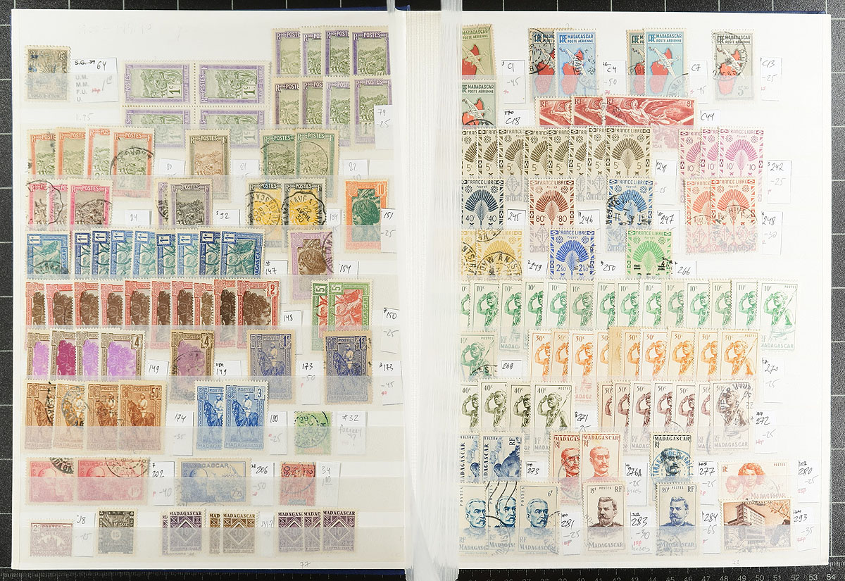 A wide-ranging group of French colonies and territories filling a 32-page Uni-Safe stockbook. Countries represented include Malagasy Madagascar, Djibouti, Algeria, Libya, Morocco, Laos, Cambodia, Levant, Guadeloupe, Guiana, FSAT, Wallis and Futuna, St. Pierre and Miquelon (lots of postage dues), and more! Owner counts 2,510 stamps, with moderate to heavy duplication. Mint, used, mostly more common items, but with individual items to $10.00 catalogue value. Great exploration lot here! Estimate =