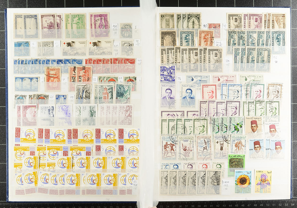 A wide-ranging group of French colonies and territories filling a 32-page Uni-Safe stockbook. Countries represented include Malagasy Madagascar, Djibouti, Algeria, Libya, Morocco, Laos, Cambodia, Levant, Guadeloupe, Guiana, FSAT, Wallis and Futuna, St. Pierre and Miquelon (lots of postage dues), and more! Owner counts 2,510 stamps, with moderate to heavy duplication. Mint, used, mostly more common items, but with individual items to $10.00 catalogue value. Great exploration lot here! Estimate =