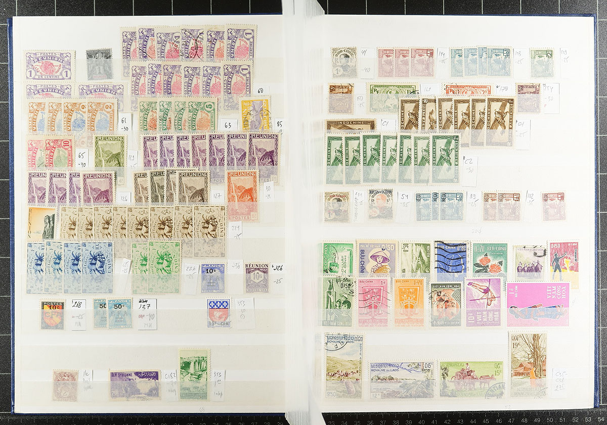 A wide-ranging group of French colonies and territories filling a 32-page Uni-Safe stockbook. Countries represented include Malagasy Madagascar, Djibouti, Algeria, Libya, Morocco, Laos, Cambodia, Levant, Guadeloupe, Guiana, FSAT, Wallis and Futuna, St. Pierre and Miquelon (lots of postage dues), and more! Owner counts 2,510 stamps, with moderate to heavy duplication. Mint, used, mostly more common items, but with individual items to $10.00 catalogue value. Great exploration lot here! Estimate =