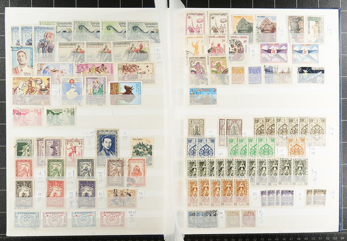 A wide-ranging group of French colonies and territories filling a 32-page Uni-Safe stockbook. Countries represented include Malagasy Madagascar, Djibouti, Algeria, Libya, Morocco, Laos, Cambodia, Levant, Guadeloupe, Guiana, FSAT, Wallis and Futuna, St. Pierre and Miquelon (lots of postage dues), and more! Owner counts 2,510 stamps, with moderate to heavy duplication. Mint, used, mostly more common items, but with individual items to $10.00 catalogue value. Great exploration lot here! Estimate =