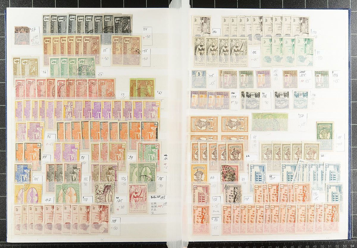 A wide-ranging group of French colonies and territories filling a 32-page Uni-Safe stockbook. Countries represented include Malagasy Madagascar, Djibouti, Algeria, Libya, Morocco, Laos, Cambodia, Levant, Guadeloupe, Guiana, FSAT, Wallis and Futuna, St. Pierre and Miquelon (lots of postage dues), and more! Owner counts 2,510 stamps, with moderate to heavy duplication. Mint, used, mostly more common items, but with individual items to $10.00 catalogue value. Great exploration lot here! Estimate =