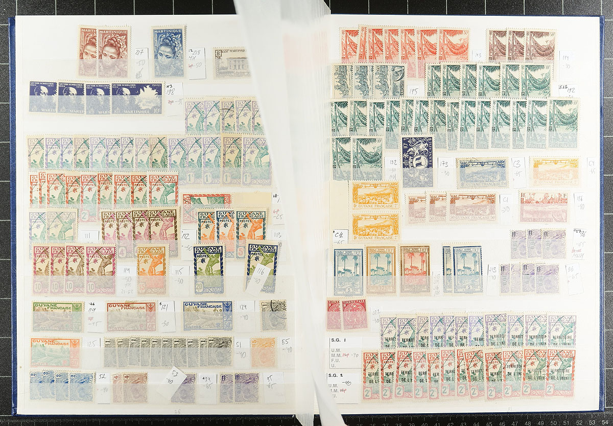 A wide-ranging group of French colonies and territories filling a 32-page Uni-Safe stockbook. Countries represented include Malagasy Madagascar, Djibouti, Algeria, Libya, Morocco, Laos, Cambodia, Levant, Guadeloupe, Guiana, FSAT, Wallis and Futuna, St. Pierre and Miquelon (lots of postage dues), and more! Owner counts 2,510 stamps, with moderate to heavy duplication. Mint, used, mostly more common items, but with individual items to $10.00 catalogue value. Great exploration lot here! Estimate =