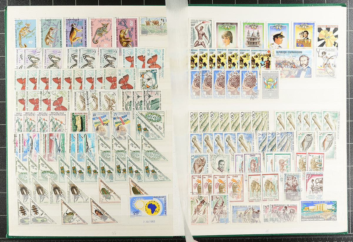 A wide-ranging group of French African colonies filling a 32-page stockbook. Countries represented include Occidental Africa, Mauritania, Senegal, Mali, Guinea, Ivory Coast, Upper Volta/Burkina Faso, Dahomey, Benin, Niger, Equatorial Africa, Gabon, Central African Republic, Chad, Congo, Togo, Cameroon, and more! Owner counts 2,658 stamps, with moderate to heavy duplication. Mint, used, mostly more common items, but with individual items to $10.00 catalogue value. Great exploration lot here! Estimate =
