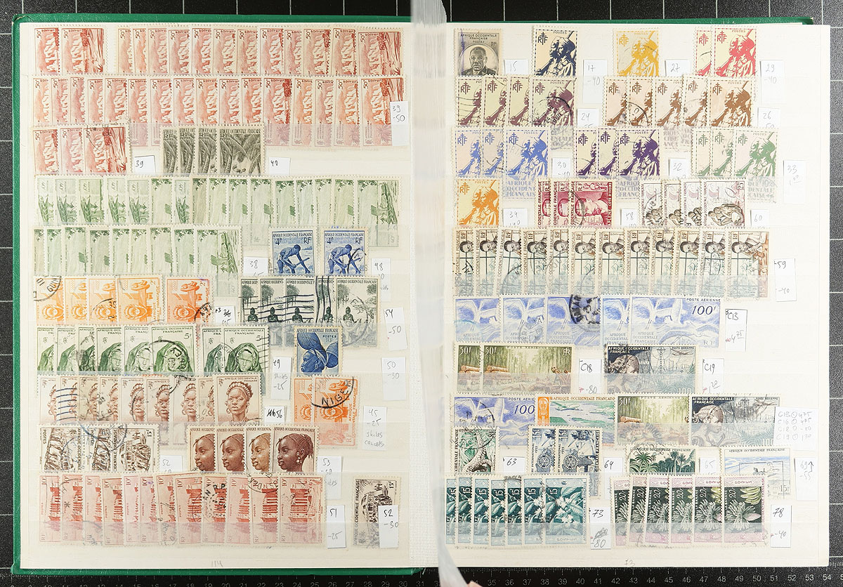 A wide-ranging group of French African colonies filling a 32-page stockbook. Countries represented include Occidental Africa, Mauritania, Senegal, Mali, Guinea, Ivory Coast, Upper Volta/Burkina Faso, Dahomey, Benin, Niger, Equatorial Africa, Gabon, Central African Republic, Chad, Congo, Togo, Cameroon, and more! Owner counts 2,658 stamps, with moderate to heavy duplication. Mint, used, mostly more common items, but with individual items to $10.00 catalogue value. Great exploration lot here! Estimate =
