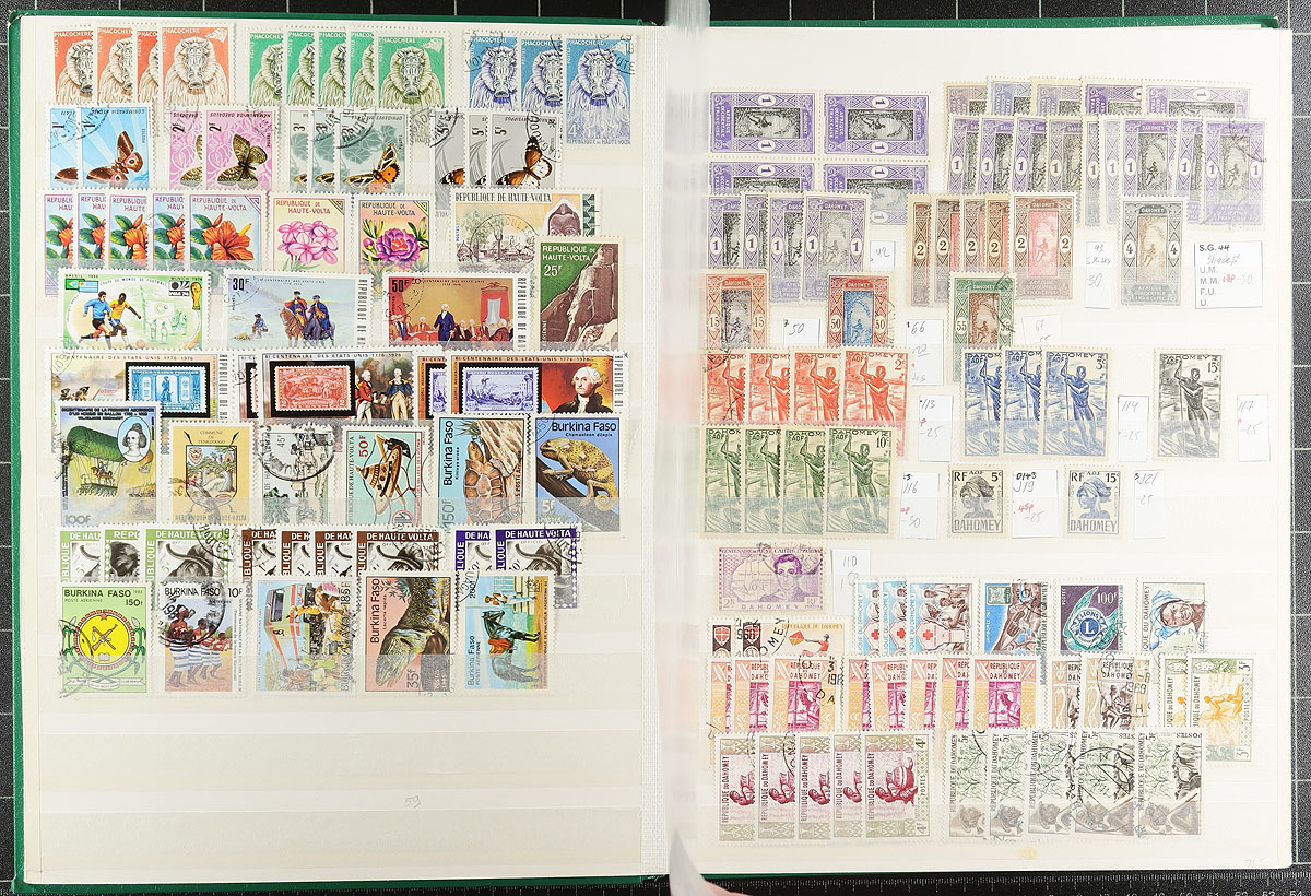 A wide-ranging group of French African colonies filling a 32-page stockbook. Countries represented include Occidental Africa, Mauritania, Senegal, Mali, Guinea, Ivory Coast, Upper Volta/Burkina Faso, Dahomey, Benin, Niger, Equatorial Africa, Gabon, Central African Republic, Chad, Congo, Togo, Cameroon, and more! Owner counts 2,658 stamps, with moderate to heavy duplication. Mint, used, mostly more common items, but with individual items to $10.00 catalogue value. Great exploration lot here! Estimate =