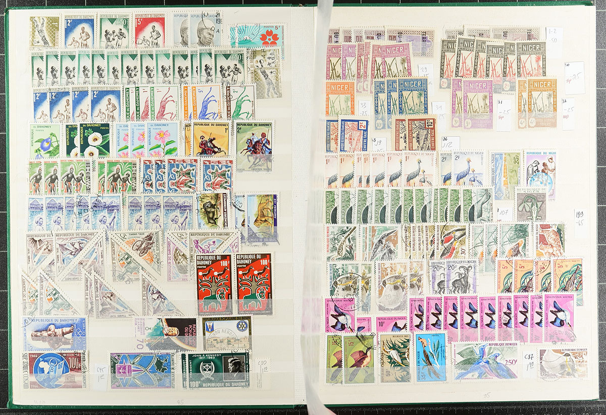 A wide-ranging group of French African colonies filling a 32-page stockbook. Countries represented include Occidental Africa, Mauritania, Senegal, Mali, Guinea, Ivory Coast, Upper Volta/Burkina Faso, Dahomey, Benin, Niger, Equatorial Africa, Gabon, Central African Republic, Chad, Congo, Togo, Cameroon, and more! Owner counts 2,658 stamps, with moderate to heavy duplication. Mint, used, mostly more common items, but with individual items to $10.00 catalogue value. Great exploration lot here! Estimate =