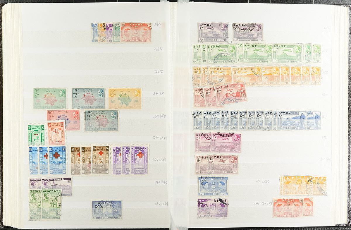 Researcher dream lot of 1919 to 1975 issues, both mint and used, with a dizzying array of inter-war era overprints, with good coverage to the end of the Selassie reign and some semi-postal and airmail. Thousands of stamps, organized into a 56-page stockbook (not sure if it was rebuilt or suffered a production issue, but a few pages in the centre are mounted upside down(!). A holding that hasn’t seen the light of day in almost 50 years! Estimate =