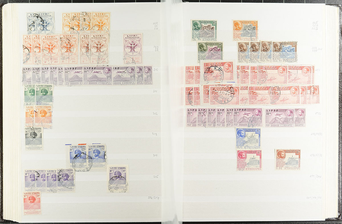 Researcher dream lot of 1919 to 1975 issues, both mint and used, with a dizzying array of inter-war era overprints, with good coverage to the end of the Selassie reign and some semi-postal and airmail. Thousands of stamps, organized into a 56-page stockbook (not sure if it was rebuilt or suffered a production issue, but a few pages in the centre are mounted upside down(!). A holding that hasn’t seen the light of day in almost 50 years! Estimate =