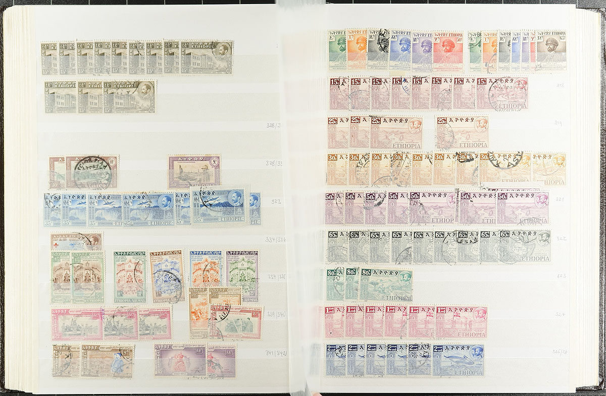 Researcher dream lot of 1919 to 1975 issues, both mint and used, with a dizzying array of inter-war era overprints, with good coverage to the end of the Selassie reign and some semi-postal and airmail. Thousands of stamps, organized into a 56-page stockbook (not sure if it was rebuilt or suffered a production issue, but a few pages in the centre are mounted upside down(!). A holding that hasn’t seen the light of day in almost 50 years! Estimate =