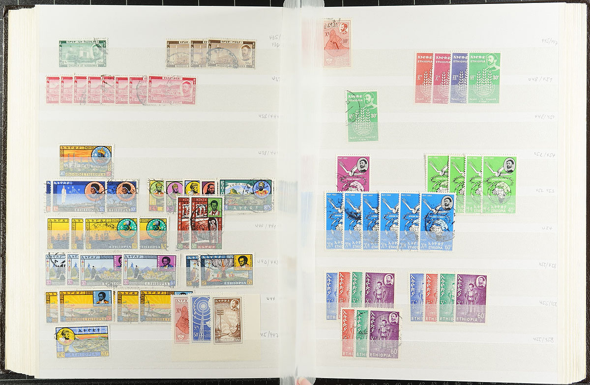 Researcher dream lot of 1919 to 1975 issues, both mint and used, with a dizzying array of inter-war era overprints, with good coverage to the end of the Selassie reign and some semi-postal and airmail. Thousands of stamps, organized into a 56-page stockbook (not sure if it was rebuilt or suffered a production issue, but a few pages in the centre are mounted upside down(!). A holding that hasn’t seen the light of day in almost 50 years! Estimate =