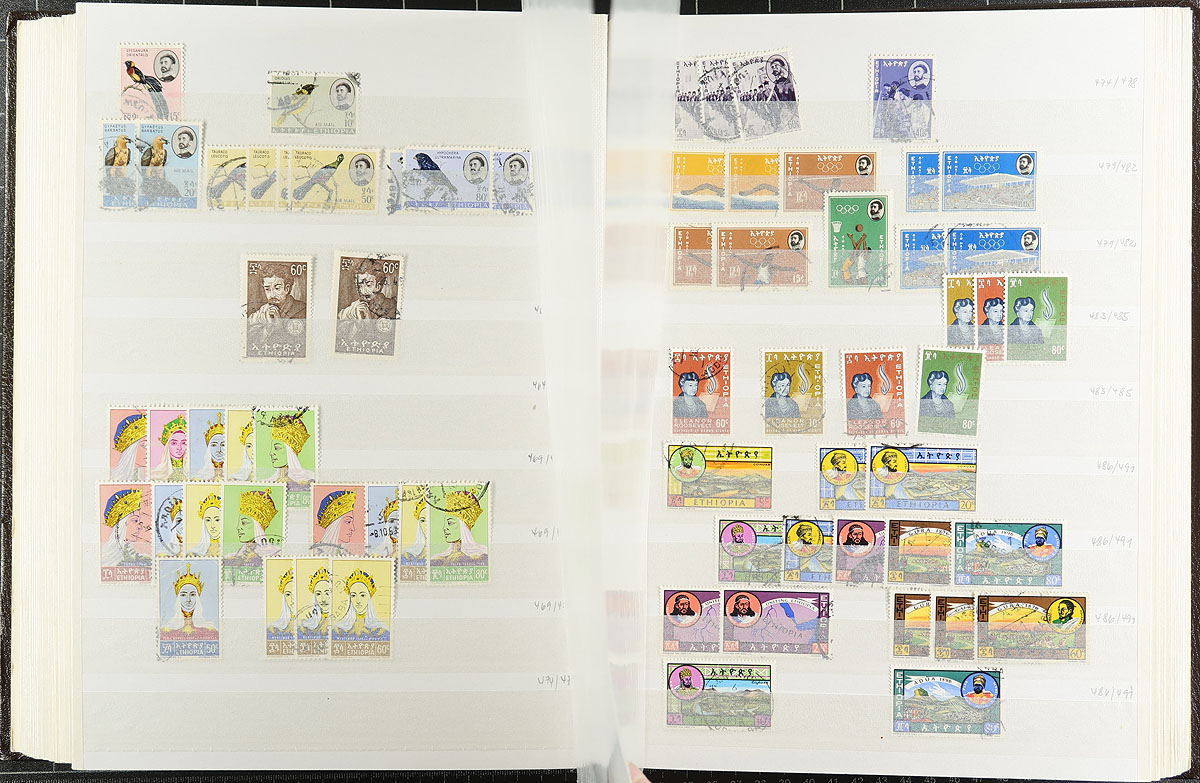 Researcher dream lot of 1919 to 1975 issues, both mint and used, with a dizzying array of inter-war era overprints, with good coverage to the end of the Selassie reign and some semi-postal and airmail. Thousands of stamps, organized into a 56-page stockbook (not sure if it was rebuilt or suffered a production issue, but a few pages in the centre are mounted upside down(!). A holding that hasn’t seen the light of day in almost 50 years! Estimate =