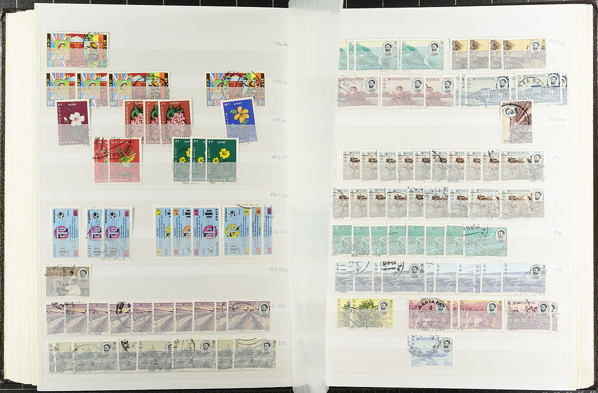 Researcher dream lot of 1919 to 1975 issues, both mint and used, with a dizzying array of inter-war era overprints, with good coverage to the end of the Selassie reign and some semi-postal and airmail. Thousands of stamps, organized into a 56-page stockbook (not sure if it was rebuilt or suffered a production issue, but a few pages in the centre are mounted upside down(!). A holding that hasn’t seen the light of day in almost 50 years! Estimate =