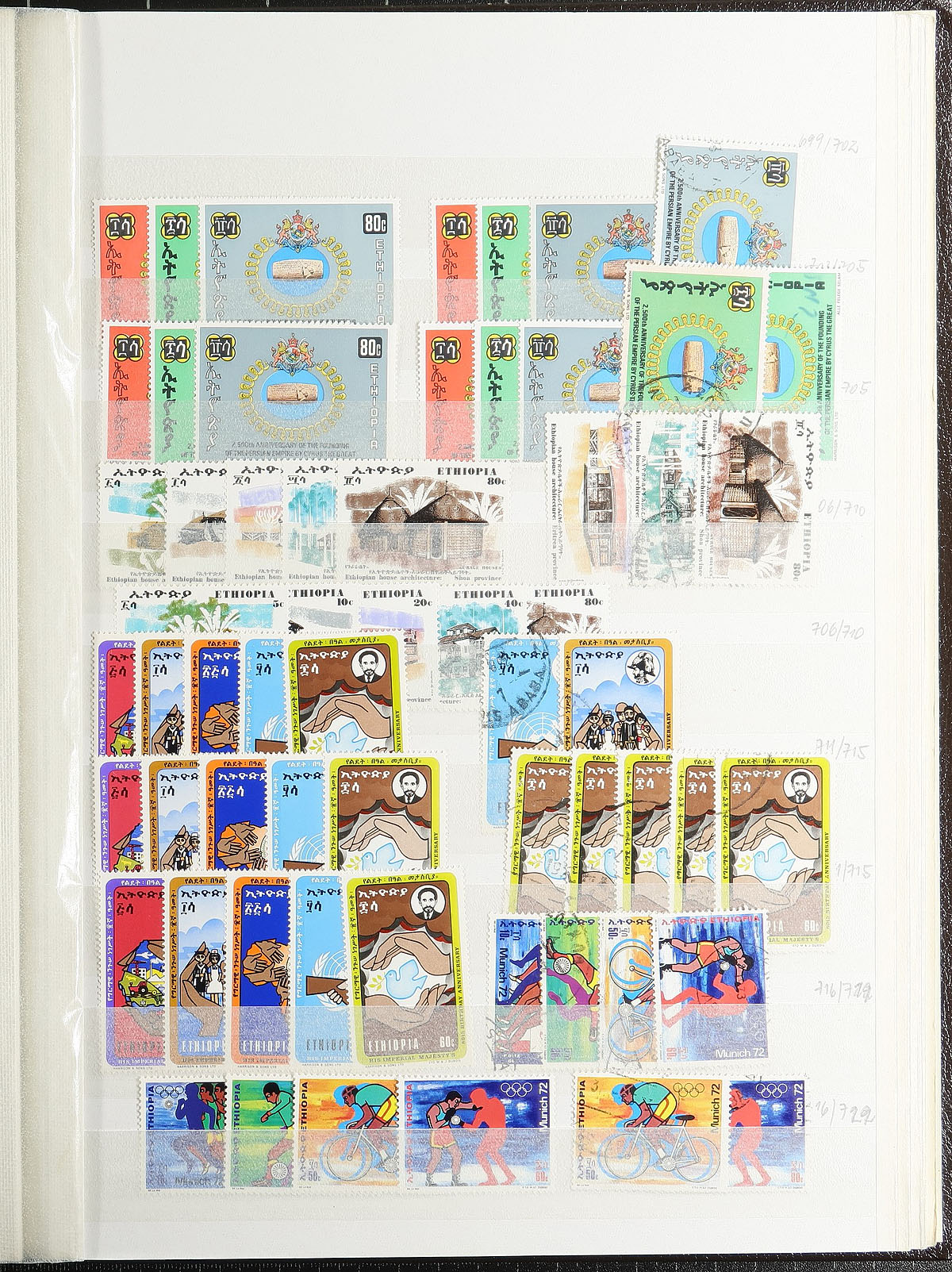 Researcher dream lot of 1919 to 1975 issues, both mint and used, with a dizzying array of inter-war era overprints, with good coverage to the end of the Selassie reign and some semi-postal and airmail. Thousands of stamps, organized into a 56-page stockbook (not sure if it was rebuilt or suffered a production issue, but a few pages in the centre are mounted upside down(!). A holding that hasn’t seen the light of day in almost 50 years! Estimate =