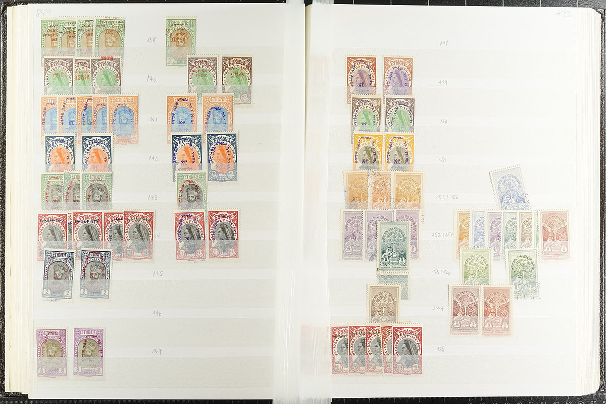 Researcher dream lot of 1919 to 1975 issues, both mint and used, with a dizzying array of inter-war era overprints, with good coverage to the end of the Selassie reign and some semi-postal and airmail. Thousands of stamps, organized into a 56-page stockbook (not sure if it was rebuilt or suffered a production issue, but a few pages in the centre are mounted upside down(!). A holding that hasn’t seen the light of day in almost 50 years! Estimate =