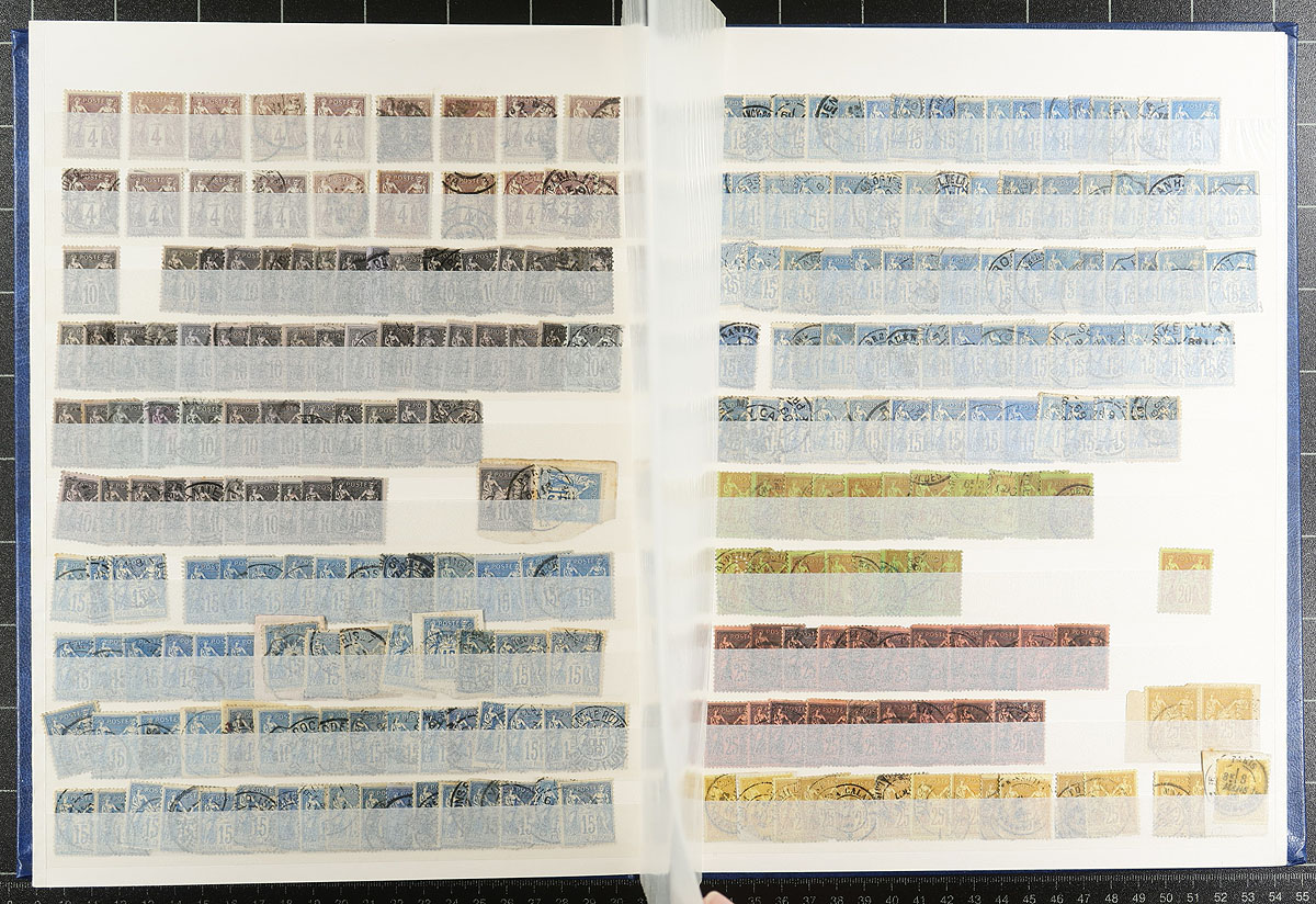 Massive and mostly 19th century used hoard packed into a 32-page Edelweiss stockbook. Substantial quantities of various "Napoleon III" issues, with lots of material for collectors of diamond dot "numeral" cancels, followed by some perforated "Bordeaux" design, and then masses of the "Peace and Commerce" issue, lots of "Sowers" and then tapering out quickly into 20th century commemoratives. Catalogue values appear to be up to $12.00 each, with thousands of stamps. A great study opportunity! Estimate =