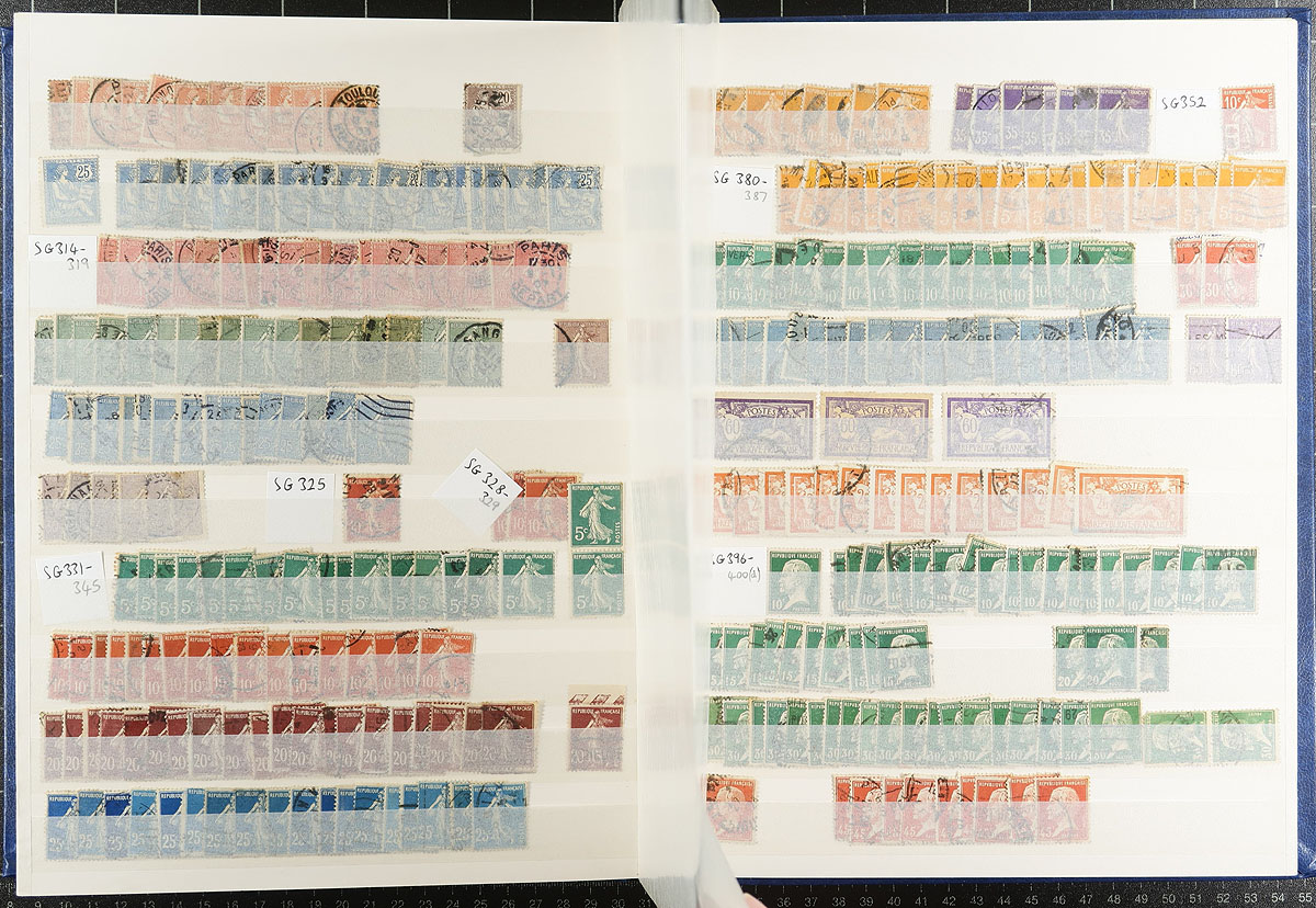 Massive and mostly 19th century used hoard packed into a 32-page Edelweiss stockbook. Substantial quantities of various "Napoleon III" issues, with lots of material for collectors of diamond dot "numeral" cancels, followed by some perforated "Bordeaux" design, and then masses of the "Peace and Commerce" issue, lots of "Sowers" and then tapering out quickly into 20th century commemoratives. Catalogue values appear to be up to $12.00 each, with thousands of stamps. A great study opportunity! Estimate =