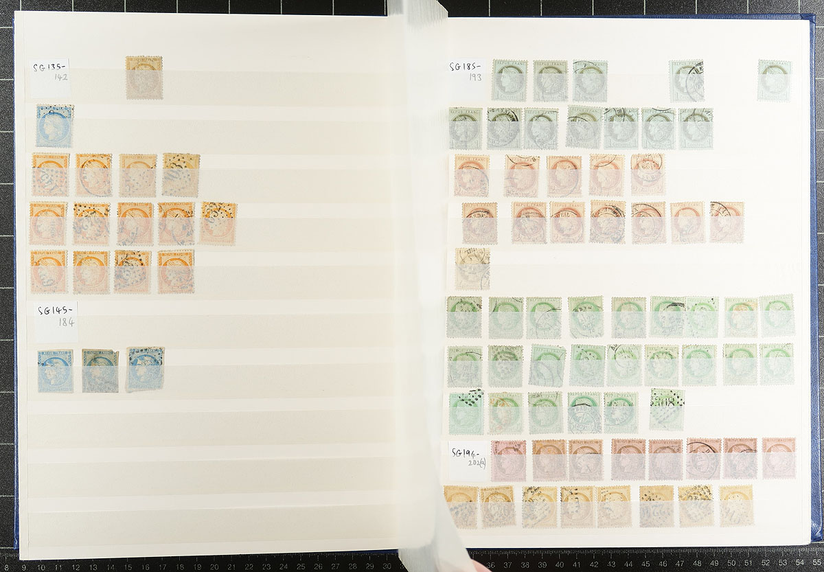 Massive and mostly 19th century used hoard packed into a 32-page Edelweiss stockbook. Substantial quantities of various "Napoleon III" issues, with lots of material for collectors of diamond dot "numeral" cancels, followed by some perforated "Bordeaux" design, and then masses of the "Peace and Commerce" issue, lots of "Sowers" and then tapering out quickly into 20th century commemoratives. Catalogue values appear to be up to $12.00 each, with thousands of stamps. A great study opportunity! Estimate =