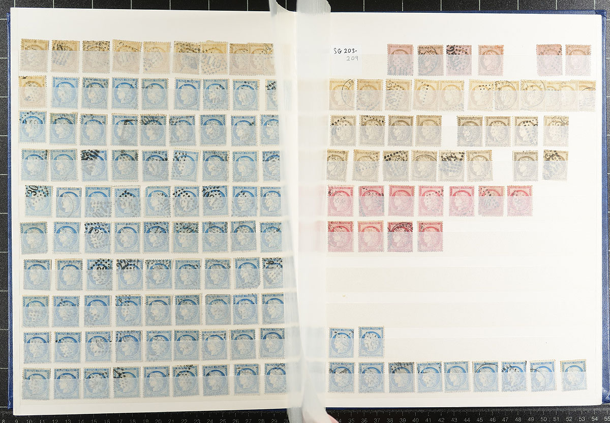 Massive and mostly 19th century used hoard packed into a 32-page Edelweiss stockbook. Substantial quantities of various "Napoleon III" issues, with lots of material for collectors of diamond dot "numeral" cancels, followed by some perforated "Bordeaux" design, and then masses of the "Peace and Commerce" issue, lots of "Sowers" and then tapering out quickly into 20th century commemoratives. Catalogue values appear to be up to $12.00 each, with thousands of stamps. A great study opportunity! Estimate =