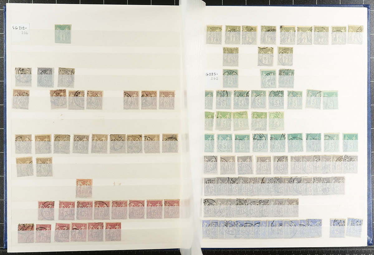 Massive and mostly 19th century used hoard packed into a 32-page Edelweiss stockbook. Substantial quantities of various "Napoleon III" issues, with lots of material for collectors of diamond dot "numeral" cancels, followed by some perforated "Bordeaux" design, and then masses of the "Peace and Commerce" issue, lots of "Sowers" and then tapering out quickly into 20th century commemoratives. Catalogue values appear to be up to $12.00 each, with thousands of stamps. A great study opportunity! Estimate =