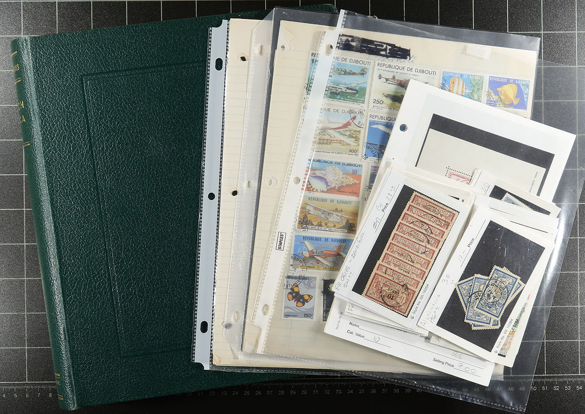 Mostly African colonies, and mostly pre-1950. Starts with a nice Scott Specialized album with an assortment of around 1000 different stamps, a mix of mint and used (most in clear mounts) from about 20 colonies. The second section is some dealer stock (a bit of "classic", noting several used copies of Zanzibar #47 and Alexandria #30) and a bit of modern), including a couple of souvenir sheets. The final is a couple of mounted groups of modern, mostly used. Lots of value here. Estimate =