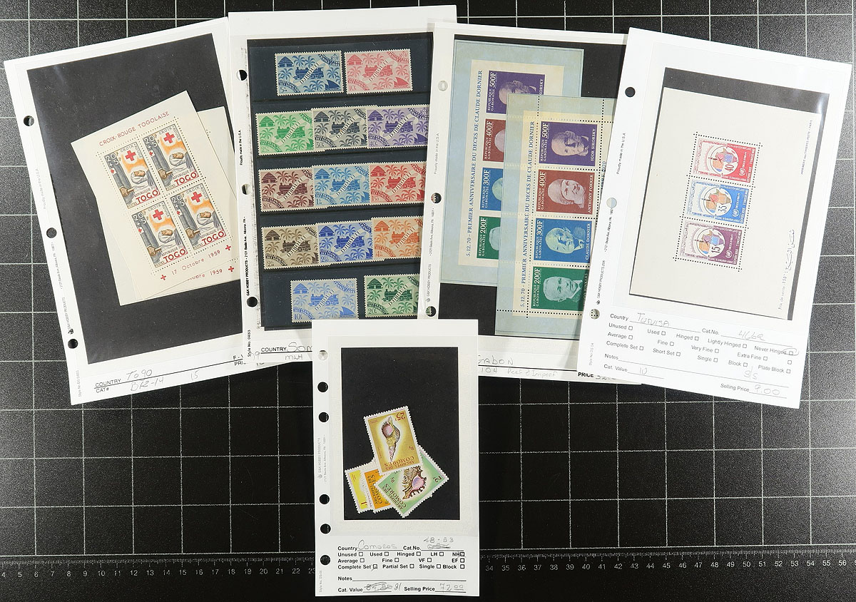 Mostly African colonies, and mostly pre-1950. Starts with a nice Scott Specialized album with an assortment of around 1000 different stamps, a mix of mint and used (most in clear mounts) from about 20 colonies. The second section is some dealer stock (a bit of "classic", noting several used copies of Zanzibar #47 and Alexandria #30) and a bit of modern), including a couple of souvenir sheets. The final is a couple of mounted groups of modern, mostly used. Lots of value here. Estimate =