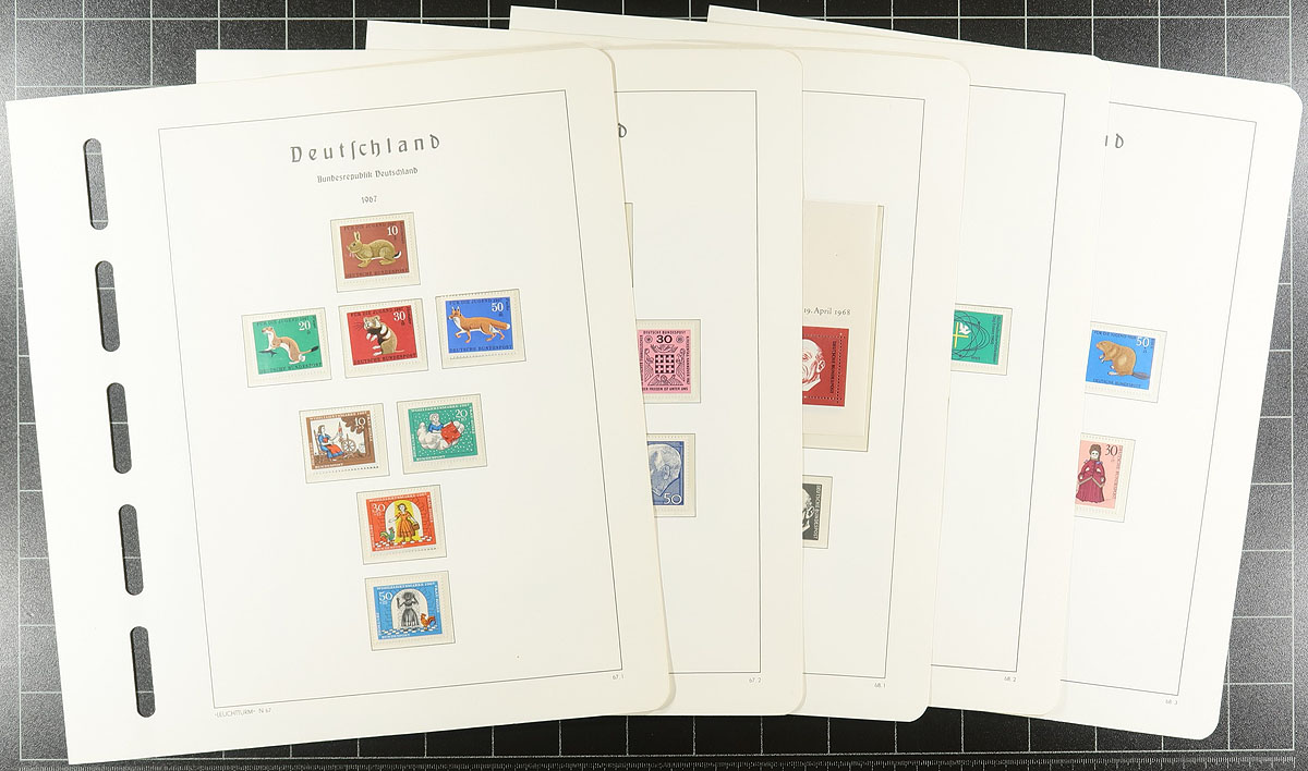 Post-war collection up to 1973 with a nice selection of regular issue and semi-postal on very nice Lighthouse hingeless pages (no springback binder). The German Federation issues are the strongest, including some nice used "portraits" issues #B310-313, #B320-323, #B327-B330, the used Beethoven souvenir sheet, etc (catalogues US$812.00). The Berlin material is not as strong with a couple of hundred dollars of catalogue value. If purchased today, the pages alone retail at $500.00! And US$1000.00 of catalogue value. Estimate =